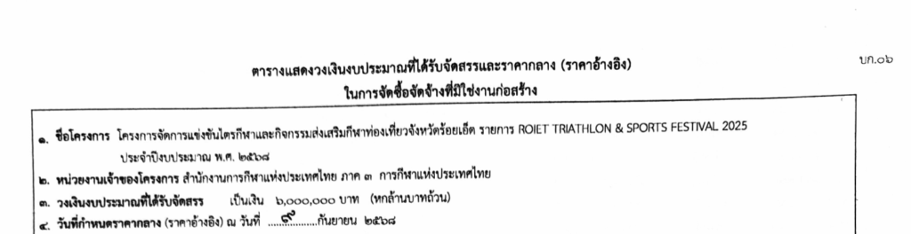 ประกาศราคากลางงานจ้าง ตารางแสดงวงเงินงบประมาณที่ได้รับจัดสรรและรายละเอียดค่าใช้จ่าย การจัดซื้อจัดจ้างที่มิใช่งานก่อสร้าง โครงการจัดการแข่งขันไตรกีฬาและกิจกรรมส่งเสริมกีฬาท่องเที่ยวจังหวัดร้อยเอ็ด ROIET TRIATHLON & SPORTS FESTIVAL 2025ณ บึงพลาญชัย อำเภอเมือง จังหวัดร้อยเอ็ด ประจำปีงบประมาณ พ.ศ. 2568